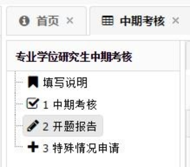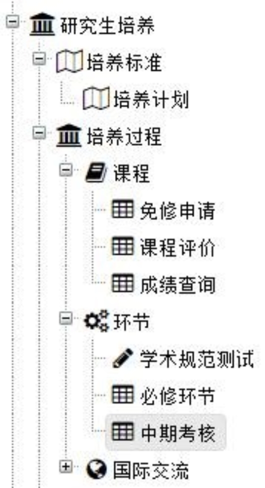 ①点击“研究生培养——培养过程——环节——中期考核”,如图: