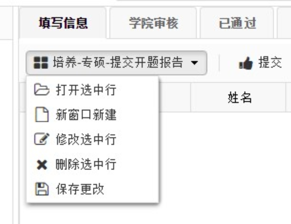 ③点击下拉窗口,选中“新窗口新建”,填写开题报告相关信息后保存,填写时请注意字数限制,超限会导致打印时部分内容无法显示。如需进行修改,可以选中行后点击“修改选中行”进行修改。如图: